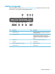 Előlapi részegységek További információért keresse fel a http://www.hp.com/go/quickspecs weboldalt, és keressen rá az adott vékony kliensre, hogy megtalálja a típus QuickSpecs adatait. 2 Elem Részegység Elem Részegység 1 Fülhallgató-csatlakozó 4 A flash meghajtó használatát jelző LED 2 USB 3.0 portok (2) 5 Tápkapcsológomb 3 USB 2.0 portok (2) 1.
