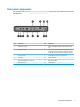 Front panel components For more information, go to http://www.hp.com/go/quickspecs and search for your specific thin client to find the QuickSpecs. 2 Item Component Item Component 1 Headset jack 4 Flash drive activity LED 2 USB 3.0 ports (2) 5 Power button 3 USB 2.