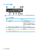 注記: お使いのモデルのコンピューターの外観は、このセクションの図と若干異なる場合がありま す。 表 1-2 フロント パネルの各部 各部 各部 1 USB Type-C SuperSpeed ポート 4 オーディオ出力(ヘッドフォン)/オーディオ 入力(マイク)コンボ コネクタ 2 USB Type-A SuperSpeed ポート(HP スリープお よび充電機能付き)* 5 メイン ストレージ ランプ 3 ヘッドフォン コネクタ 6 電源ボタン * コンピューターの電源が入っているとき、USB ポートでは USB デバイスを接続して高速データ転送を行い、 コンピューターの電源が入っていないときでも、携帯電話、カメラ、活動量計、スマートウォッチなどの製品 を充電できます。 注記: 電源が入っていると、通常、メイン ストレージ ランプは白色に点灯します。コンピューターにトラブ ルが発生している場合はメイン ストレージ ランプが赤色で点滅し、その点滅パターンで診断コードを表しま す。コードについて詳しくは、『Maintenance and Service Guide』(メンテナンスお