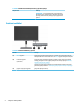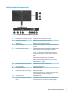 Galiniai ir šoniniai komponentai 1-1 lentelė Galiniai bei šoniniai komponentai ir jų aprašas Komponentas Funkcija (1) Nuolatinės srovės energijos įvado jungtis Skirta kintamosios srovės adapteriui prijungti. (2) Apsauginio troselio lizdas Prijungiamas pasirinktinis apsauginis kabelis. (3) HDMI prievadas HDMI kabelį prijungia prie šaltinio įrenginio. (4) „DisplayPort“ išvadas „DisplayPort“ kabelį prijungia prie antrojo monitoriaus linijiniam sujungimui.
