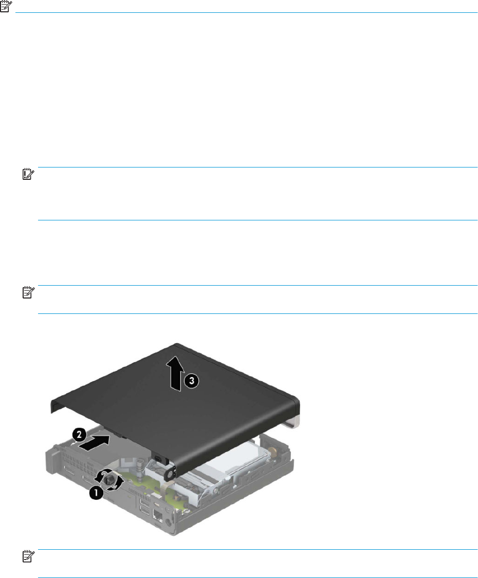 6. Отстранете специалния винт в задната част на компютъра (1). След това плъзнете панела назад