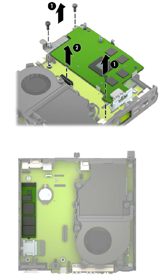 б. Отстранете трите винта (1), които фиксират графичния процесор към шасито, след това