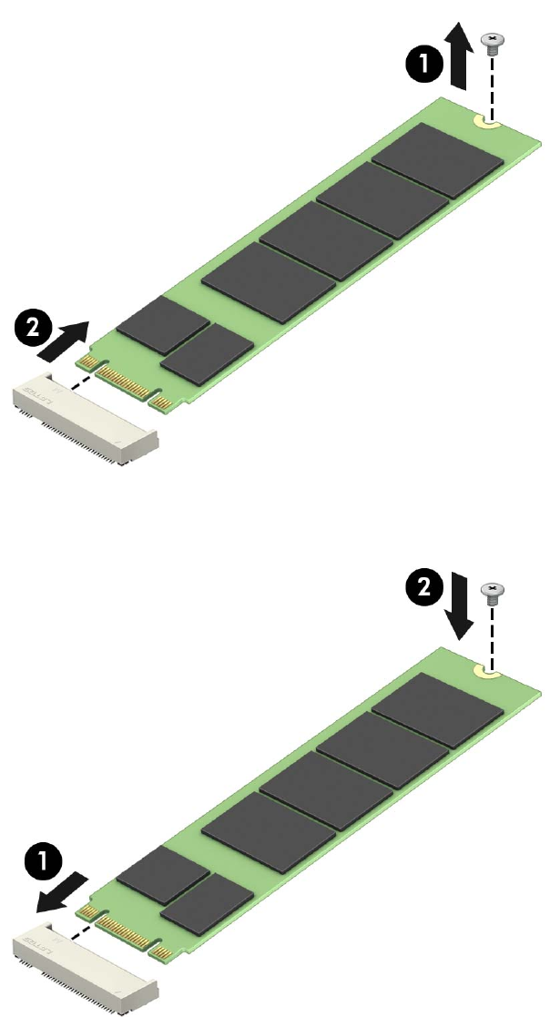 10. Плъзнете края на конектора на SSD в гнездото (1) на системната платка и след това фиксирайте