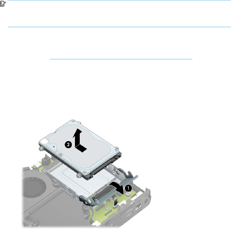 а. Завъртете блокиращото езиче на твърдия диск нагоре (1), за да освободите твърдия диск от