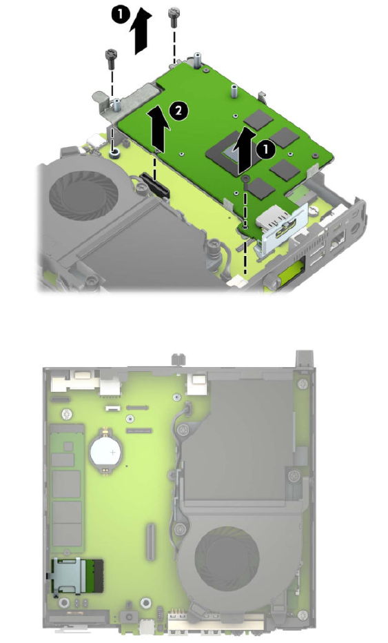 б. Отстранете трите винта (1), които фиксират графичния процесор към шасито, след това