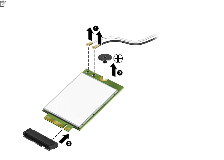 9. Откачете и двата кабела за антена (1) от WLAN модула. Отстранете винта (2), фиксиращ WLAN