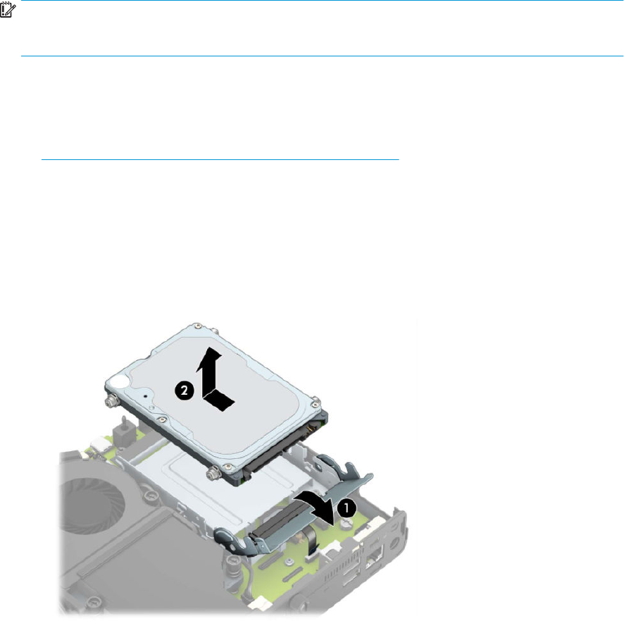 a. Draai de vergrendeling van de vaste schijf omhoog (1) om de vaste schijf uit de houder los te