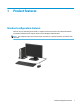 1 Product features Standard configuration features Features may vary depending on the model. For support assistance and to learn more about the hardware and software installed on your computer model, run the HP Support Assistant utility. NOTE: This computer model can be used in a tower orientation or a desktop orientation. The stand is sold separately.