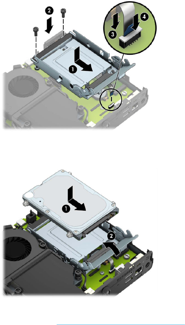 dve skrutky (2), ktoré zaisťujú šachtu pevného disku v skrinke, a potom pripojte kábel pevného disku (3)