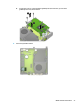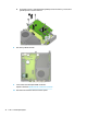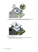 a. Irrota tuulettimen kaapeli emolevystä (1). Irrota neljä ruuvia (2) tuuletinkokoonpanosta, ja nosta