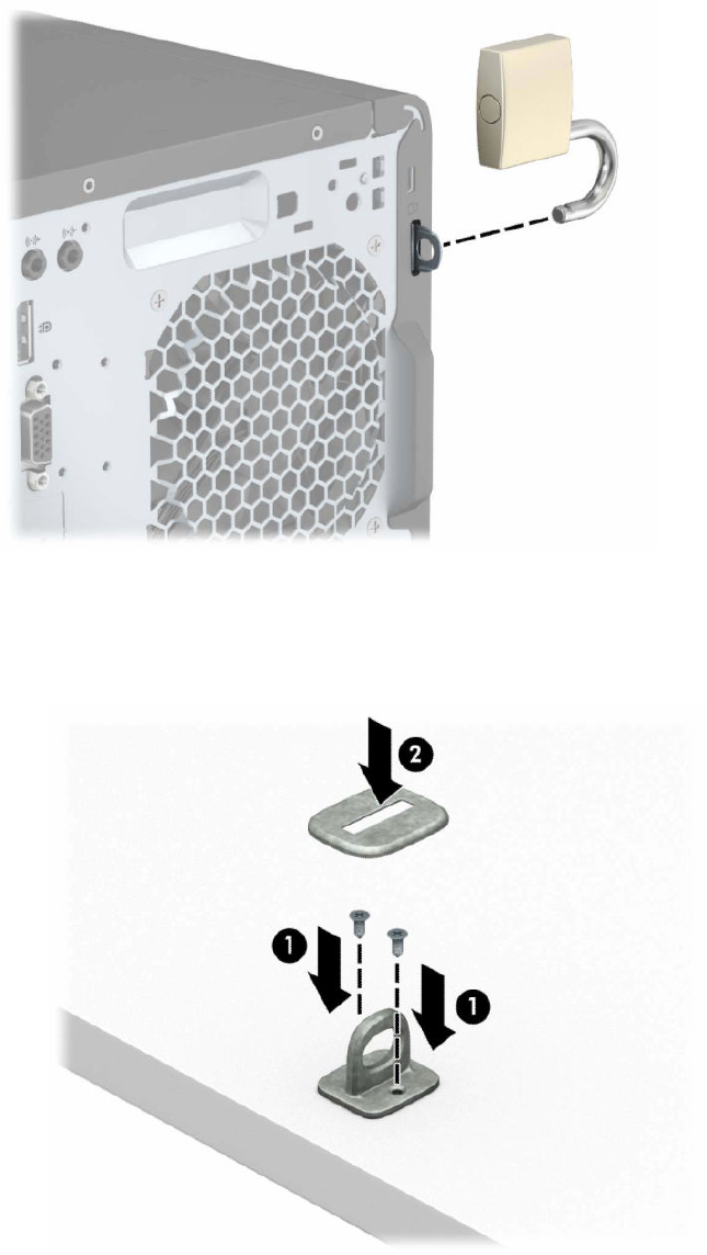 使用適合您環境的螺絲(螺絲未提供)將安全纜線固定座鎖在桌面上