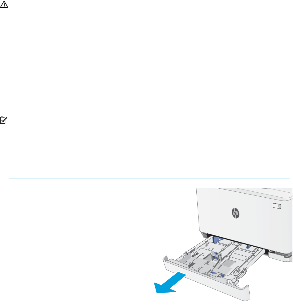 ● Ikke legg i eller fjern papir fra skuen mens utskrift pågår.