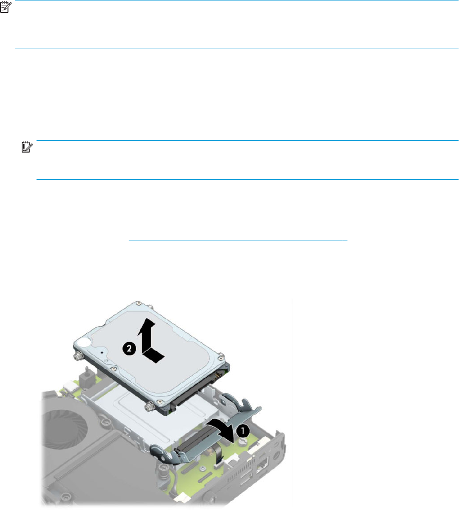 7. Ak chcete vytiahnuť pevný disk, otočte západku pevného disku smerom nahor (1), čím odpojíte pevný
