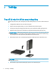 2 Thiết lập Thay đổi từ máy tính để bàn sang hướng đứng Có thể dùng máy tính này theo hướng đứng với chân đế dạng đứng tùy chọn mà có thể mua được từ HP. 1. Tháo/gỡ bất cứ thiết bị an ninh nào cấm mở máy tính. 2. Gỡ tất cả các phương tiện di động, ví dụ như ổ đĩa flash USB, ra khỏi máy tính. 3. Tắt máy tính đúng cách thông qua hệ điều hành, và sau đó tắt bất cứ thiết bị gắn ngoài nào. 4. Ngắt kết nối dây nguồn khỏi ổ cắm điện AC và ngắt kết nối bất kỳ thiết bị gắn ngoài nào.