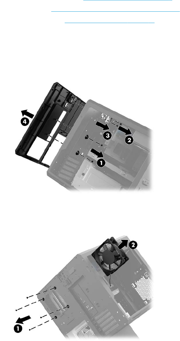 a. From the outside of the case, remove the four screws (1) that secure the fan to the case.