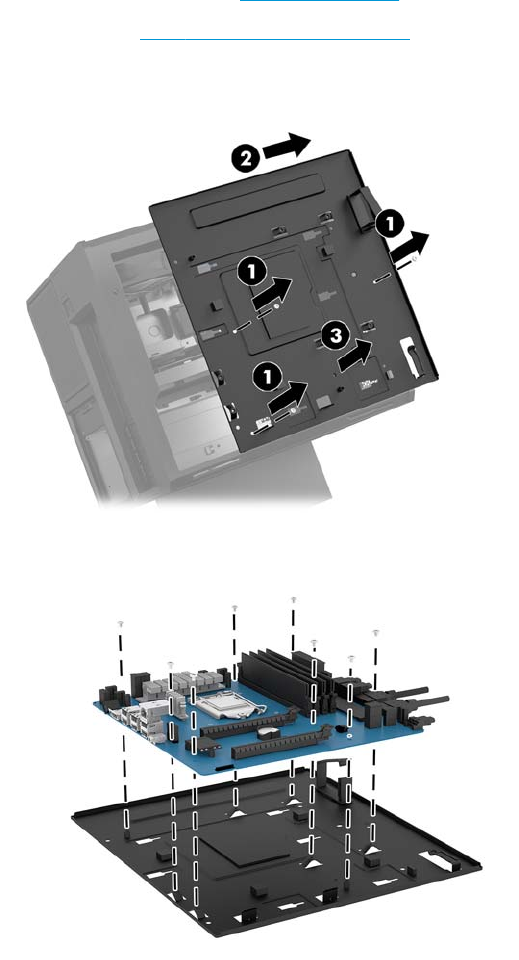 主板固定在主板托盘中。在拆卸或安装主板之前,必须先移除托盘。