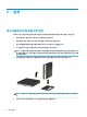 2 설치 데스크톱에서 타워 방향으로 변경 HP에서 구입 가능한 타워 받침대(선택 사양)를 사용하여 컴퓨터를 타워 방향으로 사용할 수 있습니다. 1. 컴퓨터를 열 수 없게 하는 모든 보안 장치를 제거/분리합니다. 2. 컴퓨터에서 모든 이동식 미디어(예: USB 플래시 드라이브)를 분리합니다. 3. 운영 체제를 통해 컴퓨터를 적절히 종료한 후 모든 외부 장치의 전원을 끕니다. 4. AC 콘센트에서 전원 코드를 분리하고 외부 장치를 모두 분리합니다. 중요: 전원이 켜져 있는지와 관계 없이 시스템이 활성 AC 콘센트에 연결되어 있는 한 항상 전압이 시스 템 보드에 흐릅니다. 내부 부품의 손상을 방지하려면 컴퓨터를 열기 전에 먼저 전력원에서 전원 코드를 분리해야 합니다. 5. 컴퓨터를 돌려 오른쪽 면이 위쪽을 향하도록 하여 컴퓨터를 받침대(선택 사양)에 놓습니다. 참고: 다. 6.
