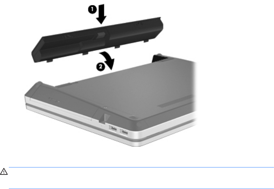 Insérez la batterie (1) dans le compartiment de batterie jusqu'à ce qu'elle soit en place (2).