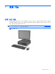 타워 구성으로 SFF 컴퓨터 사용 초소형 폼 팩터 컴퓨터는 HP 에서 선택 사양으로 구입할 수 있는 타워 받침대를 사용하여 타워 방향으 로 사용할 수 있습니다. 1. 컴퓨터를 열지 못하게 하는 모든 보안 장치를 제거/분리합니다. 2. 컴퓨터에서 모든 이동식 미디어(예: CD 또는 USB 플래시 드라이브)를 제거합니다. 3. 운영체제에 따라 컴퓨터를 적절히 종료한 후 모든 외부 장치의 전원을 끕니다. 4. 콘센트에서 전원 코드를 뽑고 외부 장치를 모두 분리합니다. 주의: 전원이 켜져 있든 꺼져 있든 상관없이 시스템이 가동 중인 AC 콘센트에 연결되어 있으면 시스템 보드에 항상 전압이 흐르는 것입니다. 컴퓨터 내부 부품의 손상을 방지하려면 전원 코드 를 분리해야 합니다. 5. 컴퓨터를 돌려 오른쪽 면이 아래쪽을 향하도록 하여 컴퓨터를 선택 사양인 받침대에 놓습니다.