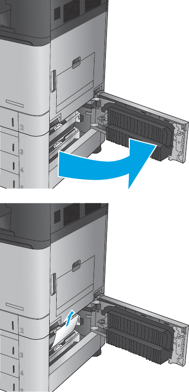 - Устранение замятий в устройстве подачи на 3 x 500 листов и в области правой нижней дверцы