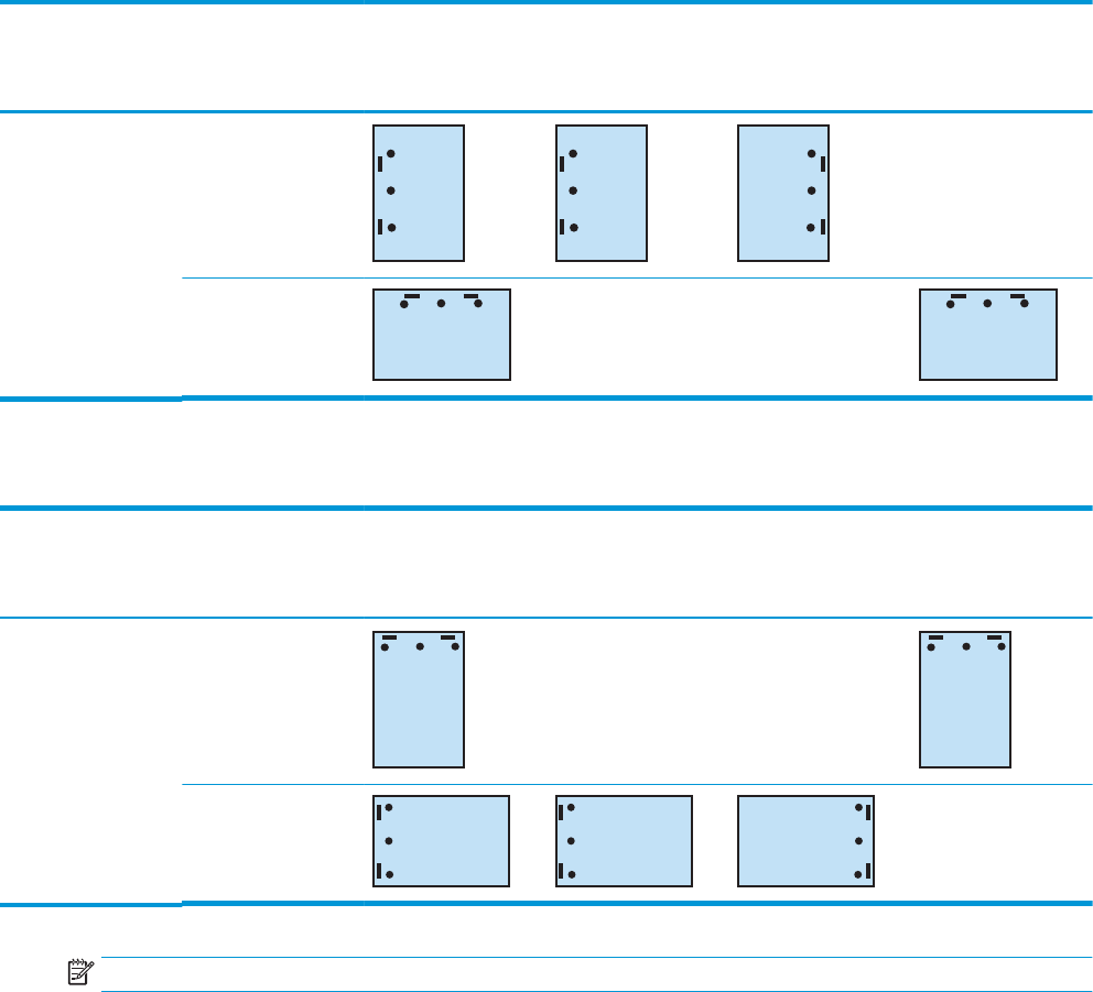 Tabulka 4-13 Možnosti děrování se třemi otvory a sešívání se dvěma svorkami podle formátu papíru – orientace plnění
