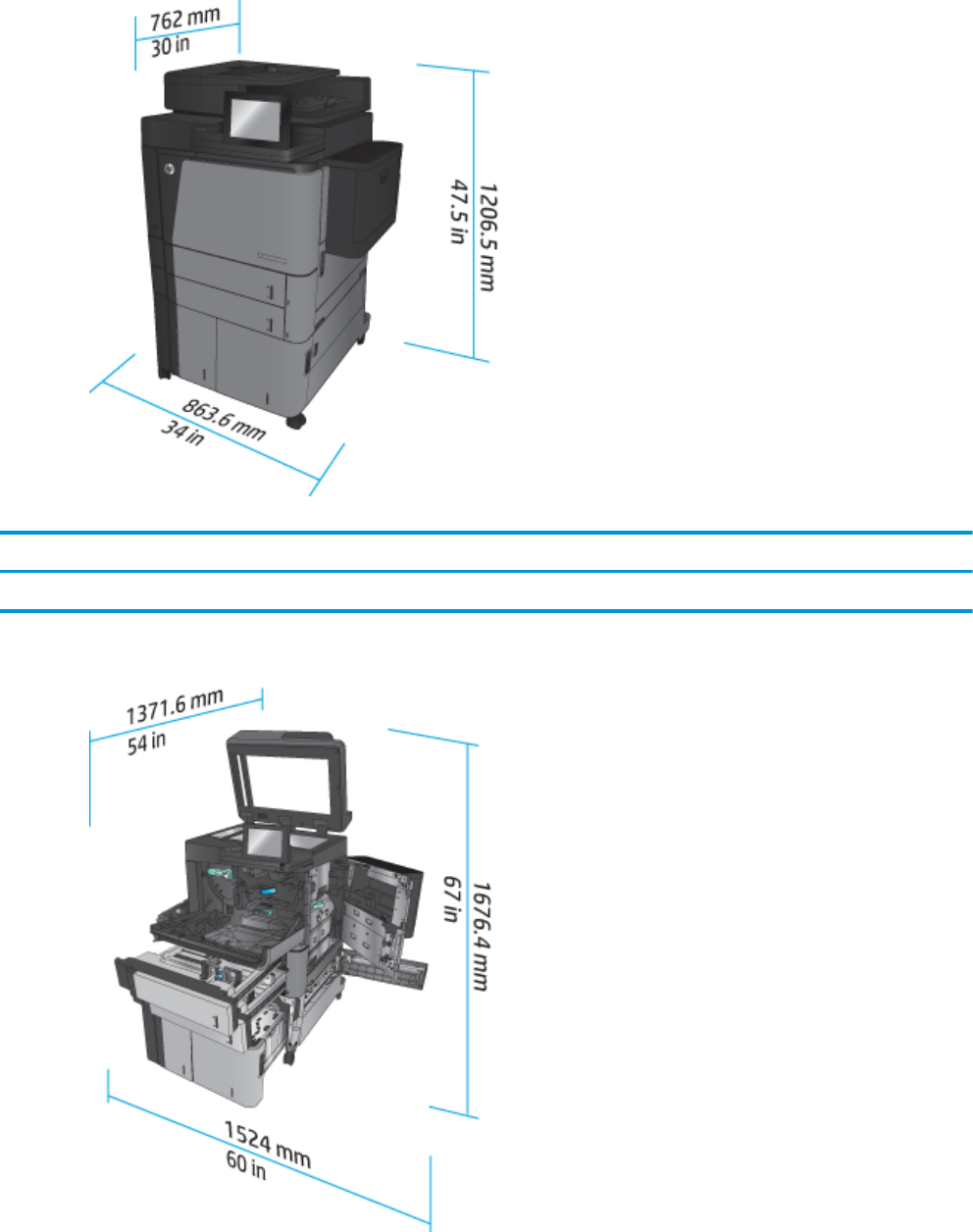 Tabulka 1-7 Prostorové požadavky produktu s plně otevřenými dvířky, zásobníky a podavačem dokumentů