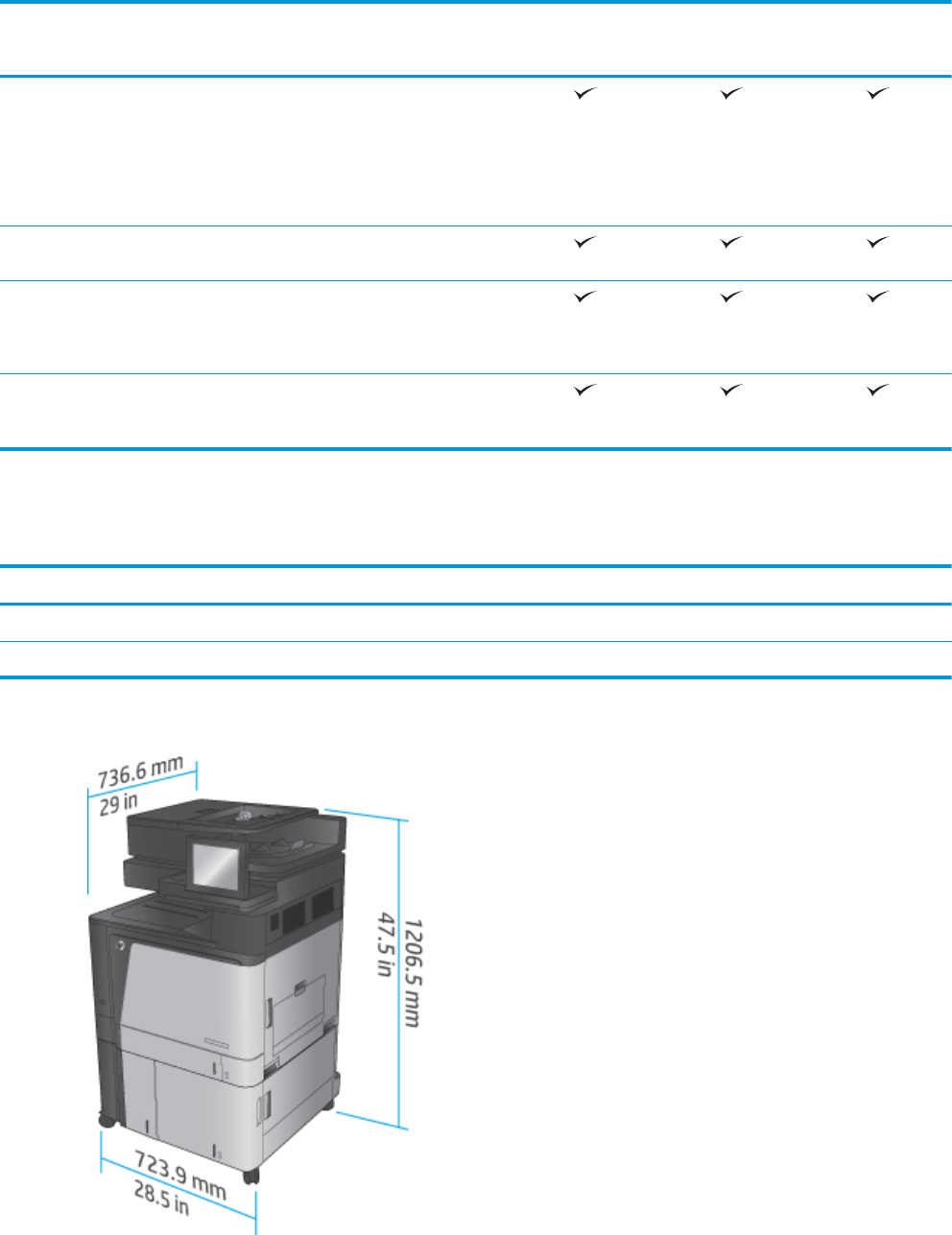 Tabulka 1-16 Rozměry produktu se všemi dvířky zavřenými a s vloženými kazetami s tonerem a tiskovými válci