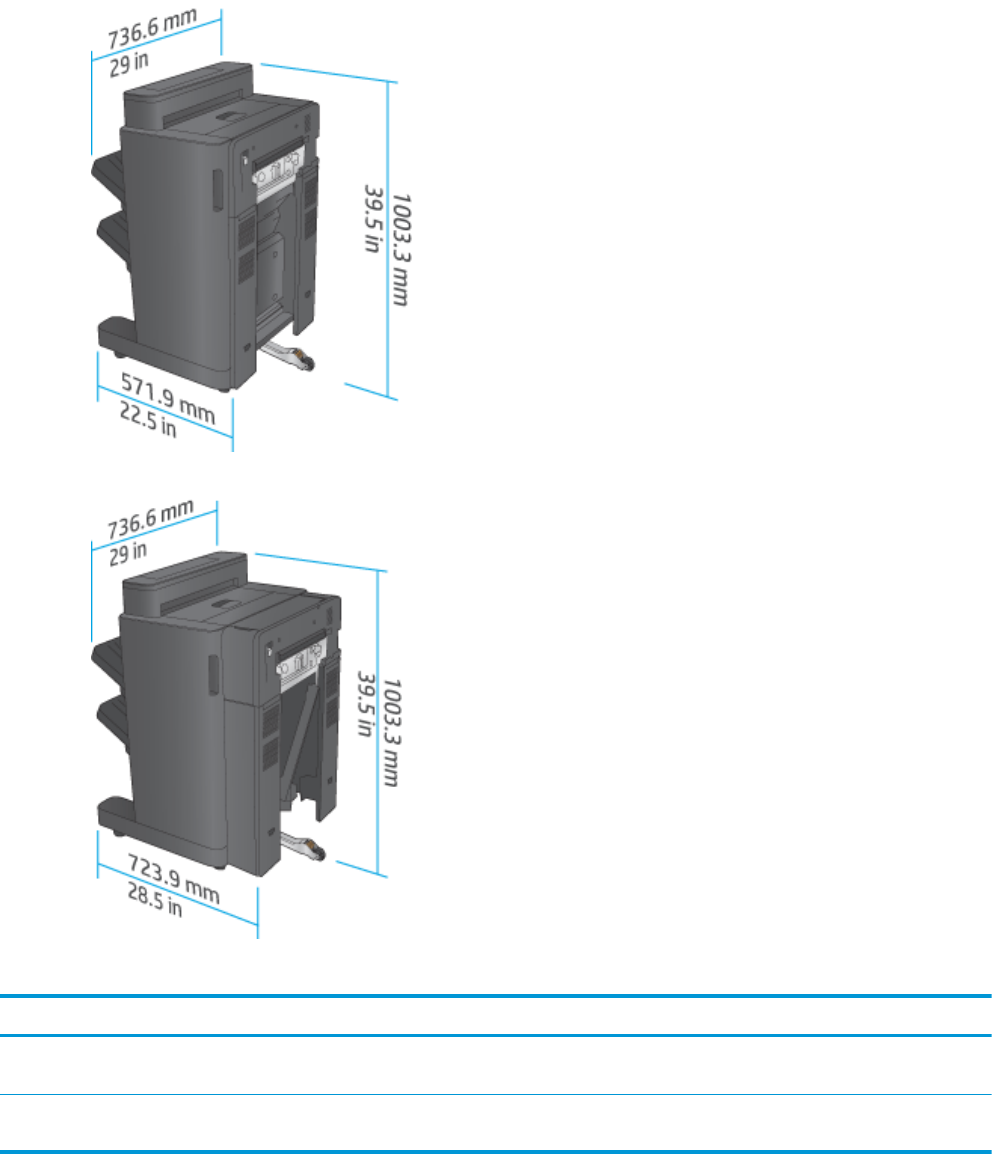 Tabulka 1-19 Prostorové požadavky produktu a dokončovacího příslušenství s plně otevřenými dvířky, zásobníky a podavačem