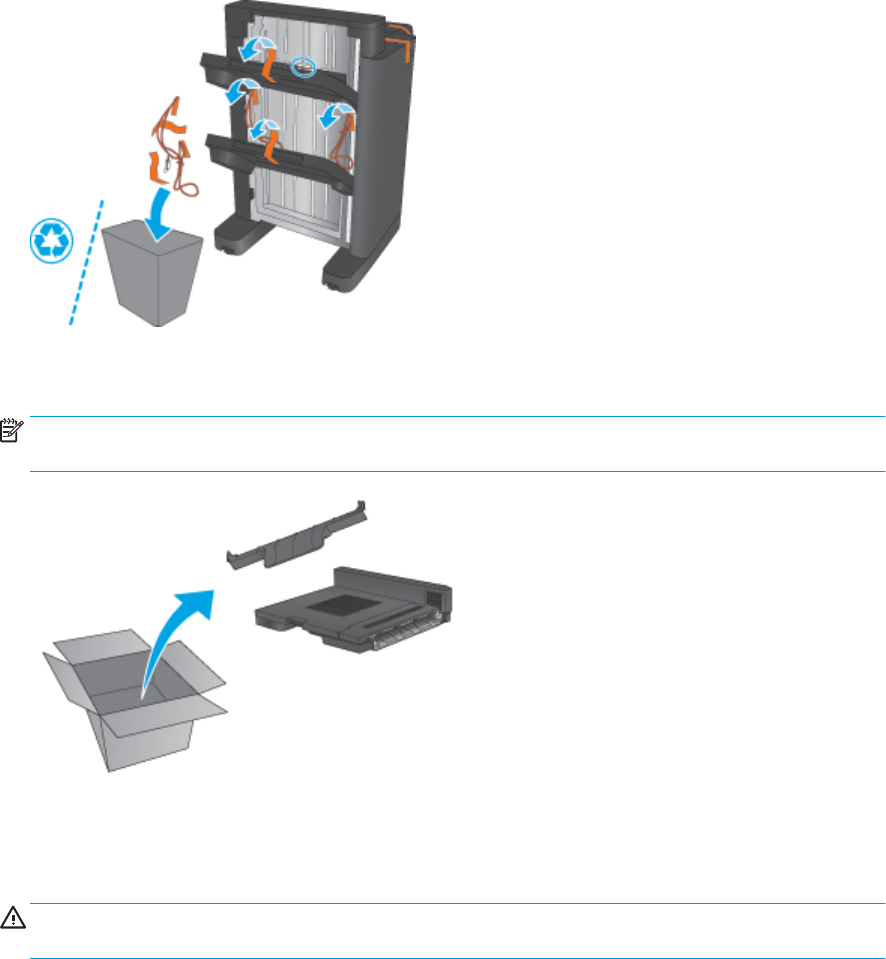 4. Pokud instalujete volitelnou jednotku sešívačky/stohovače, vyjměte z obalu střední jednotku přenosu