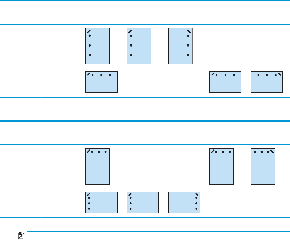 표 4-12 3 개 홀 펀치 및 1 개 스테이플 옵션(용지 크기별) – 짧은 가장자리 용지함 공급 방향