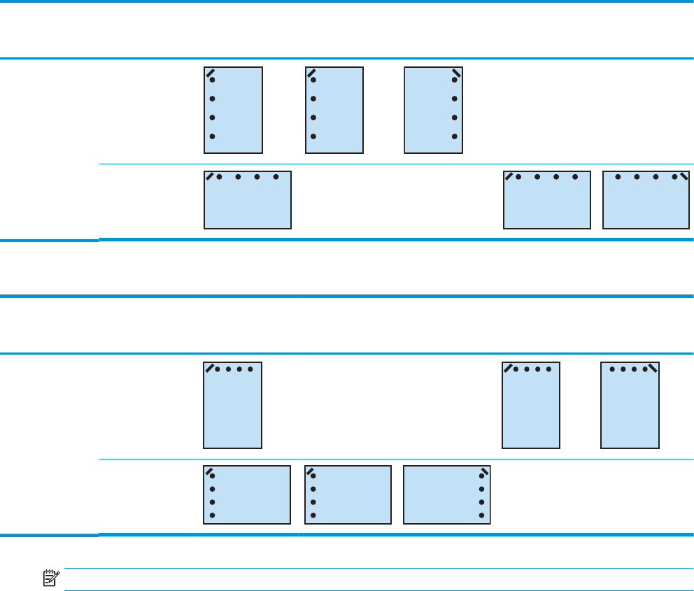 표 4-16 4 개 홀 펀치 및 1 개 스테이플 옵션(용지 크기별) – 짧은 가장자리 용지함 공급 방향