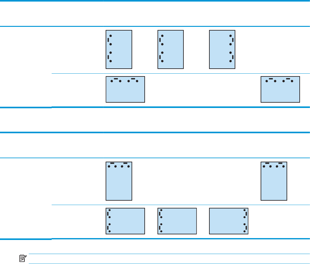 표 4-17 4 개 홀 펀치 및 2 개 스테이플 옵션(용지 크기별) – 긴 가장자리 용지함 공급 방향