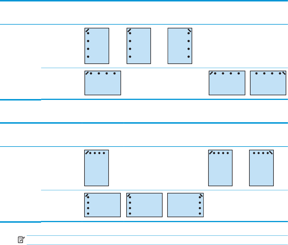 표 5-9 1 개 스테이플 및 4 개 홀 펀치 옵션(용지 크기별) – 긴 가장자리 용지함 공급 방향
