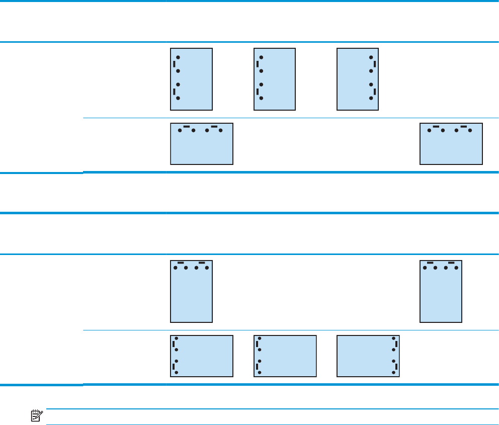 표 5-16 2 개 스테이플 및 4 개 홀 펀치 옵션(용지 크기별) – 짧은 가장자리 용지함 공급 방향