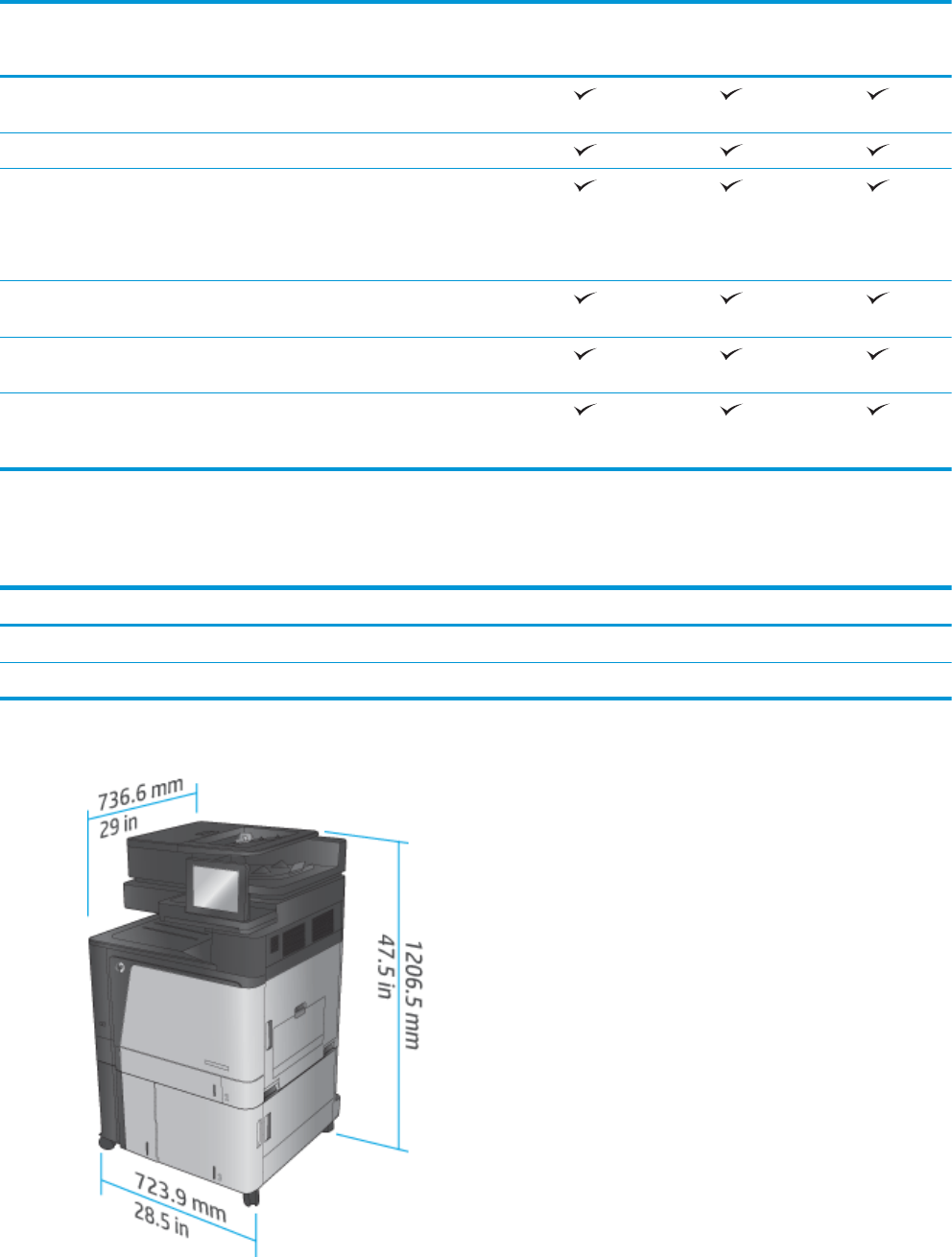 표 1-16 제품 치수(모든 도어가 닫힌 상태, 토너 카트리지 및 이미징 드럼 포함)