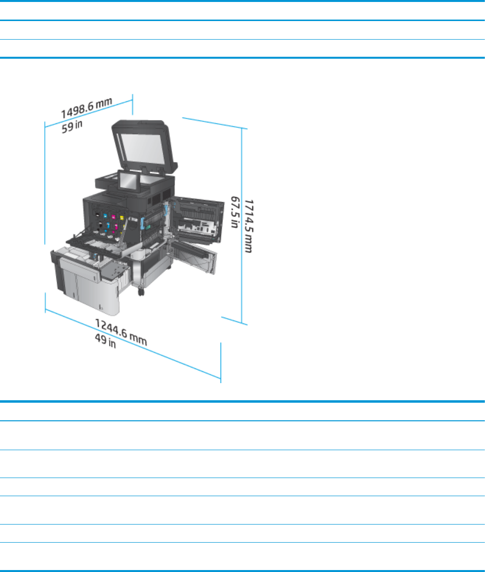 표 1-17 공간 요구 사항(모든 도어, 용지함, 문서 공급기가 완전히 열린 상태)