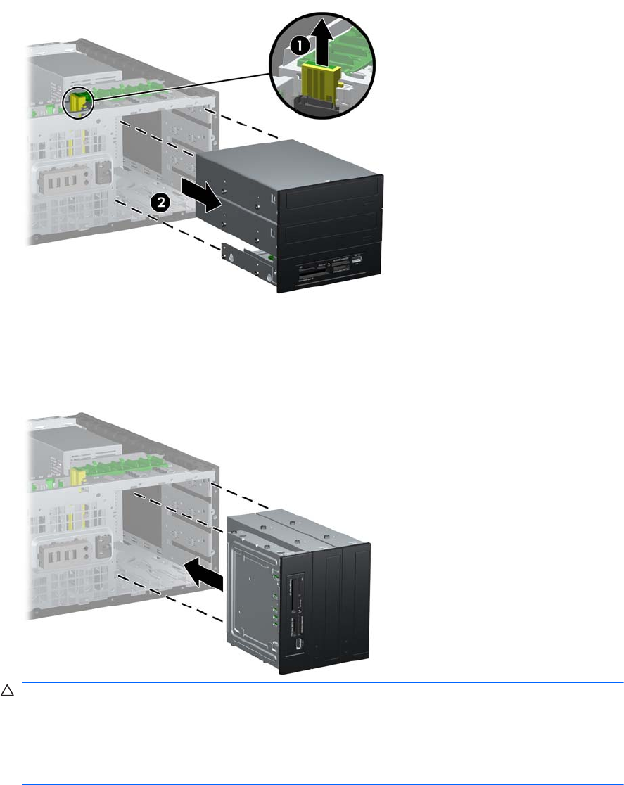 8. Pentru a elibera unităţile din docul pentru unităţi de 5,25 inchi, apăsaţi în jos dispozitivul galben