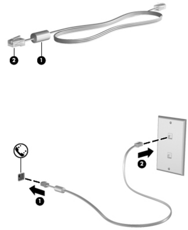 2. Ligue o cabo do modem à tomada telefónica de parede RJ-11 (2).