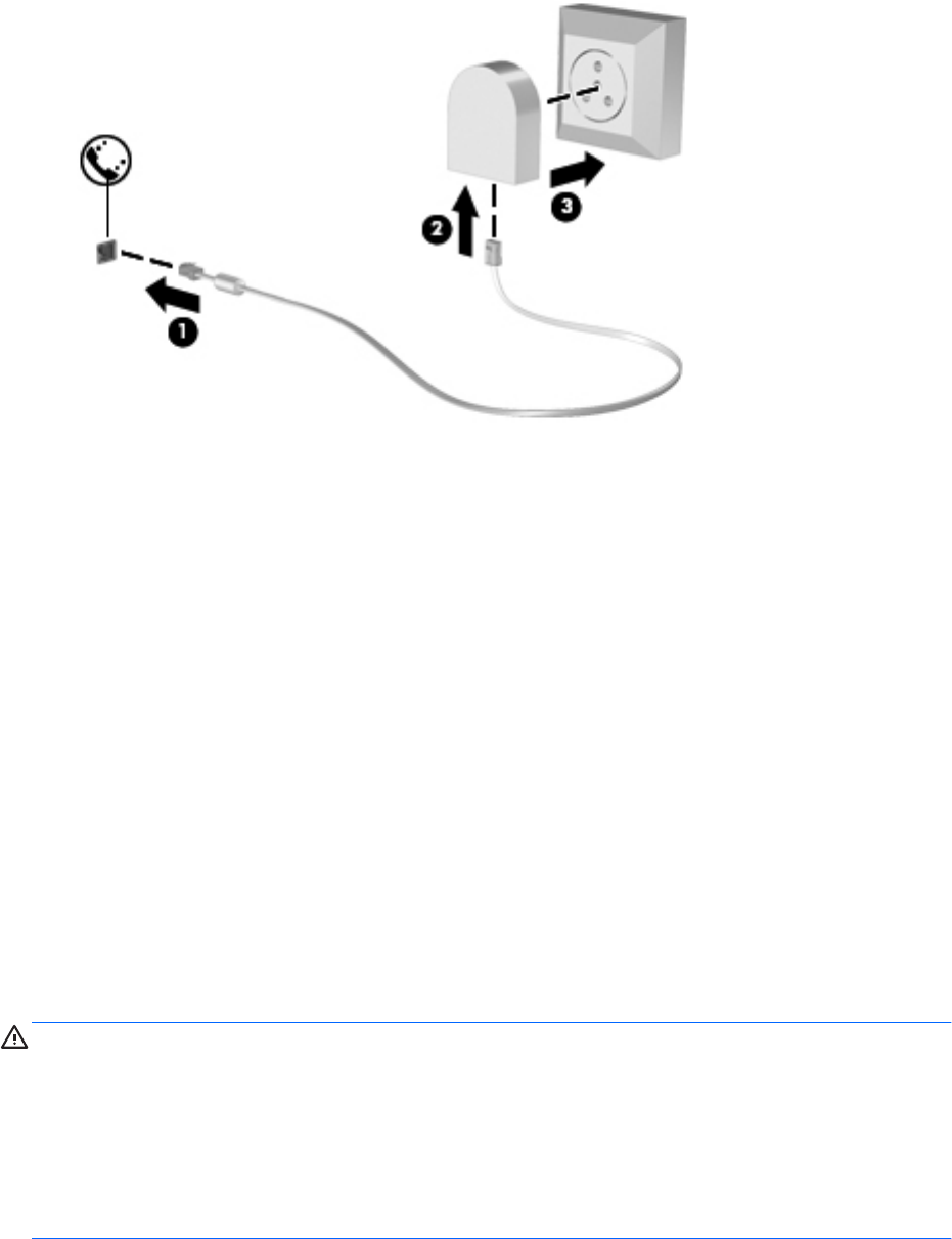 3. Ligue o adaptador do cabo do modem (3) à tomada telefónica de parede.
