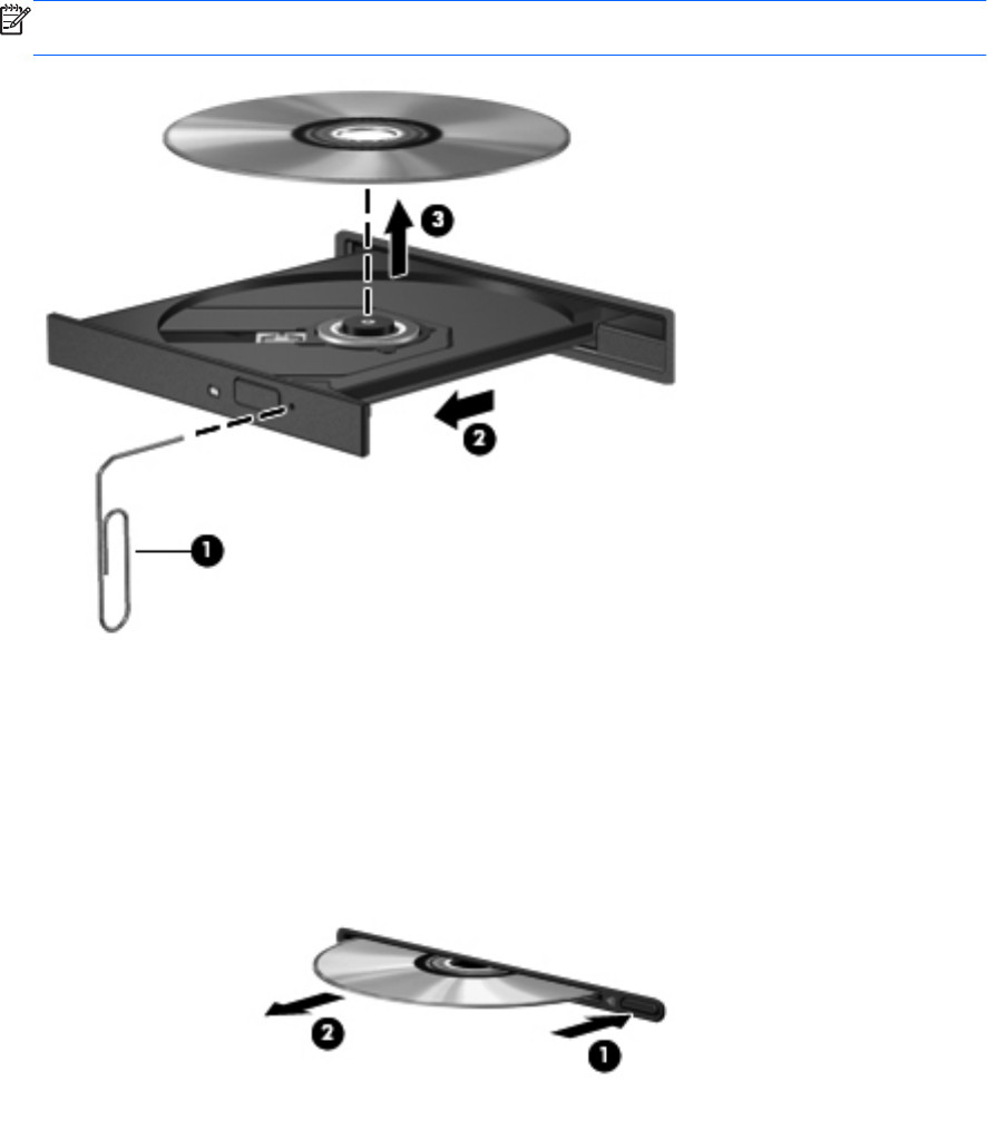 2. Empurre cuidadosamente o clip até soltar o tabuleiro e puxe-o (2) até parar.