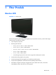 1 Fitur Produk Monitor LCD Gambar 1-1 Monitor LCD Monitor LCD (liquid crystal display) HP dilengkapi layar TFT (thin-film transistor), matriks aktif dengan lampu latar LED serta fitur-fitur berikut: ● Layar diagonal yang besar ● Resolusi grafis maksimal ◦ 2011x/ 2011xi/ 2011s: 1600 x 900 @ 60Hz ◦ 2211f / 2211x: 1920 x 1080 @ 60Hz ◦ 2311cm / 2311f / 2311x/ 2311xi: 1920 x 1080 @ 60Hz ◦ 2511x: 1920 x 1080 @ 60Hz ◦ 2711x: 1920 x 1080 @ 60Hz ◦ Plus, dukungan layar penuh untuk resolusi yang lebih