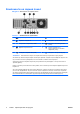 Компоненти на задния панел Фигура 1-4 Компоненти на задния панел Таблица 1-3 Компоненти на задния панел 1 Сериен съединител 6 Извод за VGA монитор 2 Паралелен съединител 7 Съединител за мишка PS/2 (зелен) 3 Съединител за захранващия кабел 8 Съединител за клавиатура PS/2 (лилав) 4 Мрежов съединител RJ-45 9 Изходен съединител за аудиоустройства със собствено захранване (зелен) 5 Универсална серийна шина (USB) 10 Съединител за звуков вход (син) ЗАБЕЛЕЖКА: Разположението и броят на съединит