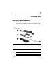 Quick tour Bottom components Component Component 1 Bluetooth® compartment 6 Docking connector 2 Vents (5) 7 Accessory battery connector 3 WLAN module compartment 8 Memory module compartment 4 Battery release latches (2) 9 Hard drive bay 5 Battery bay 2–6 Getting Started