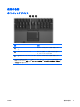 タッチパッド 名称 説明 (1) タッチパッド* ポインタを移動して、画面上の項目を選択したり、アクティブに したりします (2) 左のタッチパッド ボタン* 外付けマウスの左ボタンと同様に機能します (3) 右のタッチパッド ボタン* 外付けマウスの右ボタンと同様に機能します (4) タッチパッドのスクロール ゾーン* 画面を上下にスクロールします *この表では初期設定の状態について説明しています。ポインティング デバイスの設定を表示したり変更したりするには、 [スタート]→[コントロール パネル]→[プリンタとその他のハードウェア]→[マウス]の順に選択します。 4 第 2 章 各部の名称 JAWW