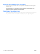 6 Rengøring af TouchPad og tastatur Snavs og fedt på TouchPad'en kan få markøren til at hoppe rundt på skærmen. Hvis du vil undgå det, skal du rengøre TouchPad'en med en fugtig klud og vaske hænderne jævnligt, når du anvender computeren. ADVARSEL! Hvis du vil mindske risikoen for elektrisk stød og beskadigelse af indvendige komponenter, skal du ikke bruge en støvsuger til at rengøre tastaturet med. Støvsugeren kan overføre støv og fnug til tastaturet.