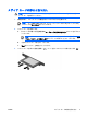 メディア カードの停止と取り出し 注意: データの消失やシステムの応答停止を防ぐため、メディア カードを取り出す前にメ ディア カードを停止してください。 1. 情報を保存し、メディア カードに関連するすべてのプログラムを閉じます。 注記: データ転送を停止するには、オペレーティング システムの[コピーしています] ウィンドウで[キャンセル]をクリックします。 2. メディア カードを停止します。 a. タスクバーの右端にある通知領域の[ハードウェアの安全な取り外し]アイコンをダブルク リックします。 注記: [ハードウェアの安全な取り外し]アイコンを表示するには、通知領域の[隠れ ているインジケータを表示します]アイコン(<または<<)をクリックします。 3. JAWW b. 一覧のメディア カード名をクリックします。 c.