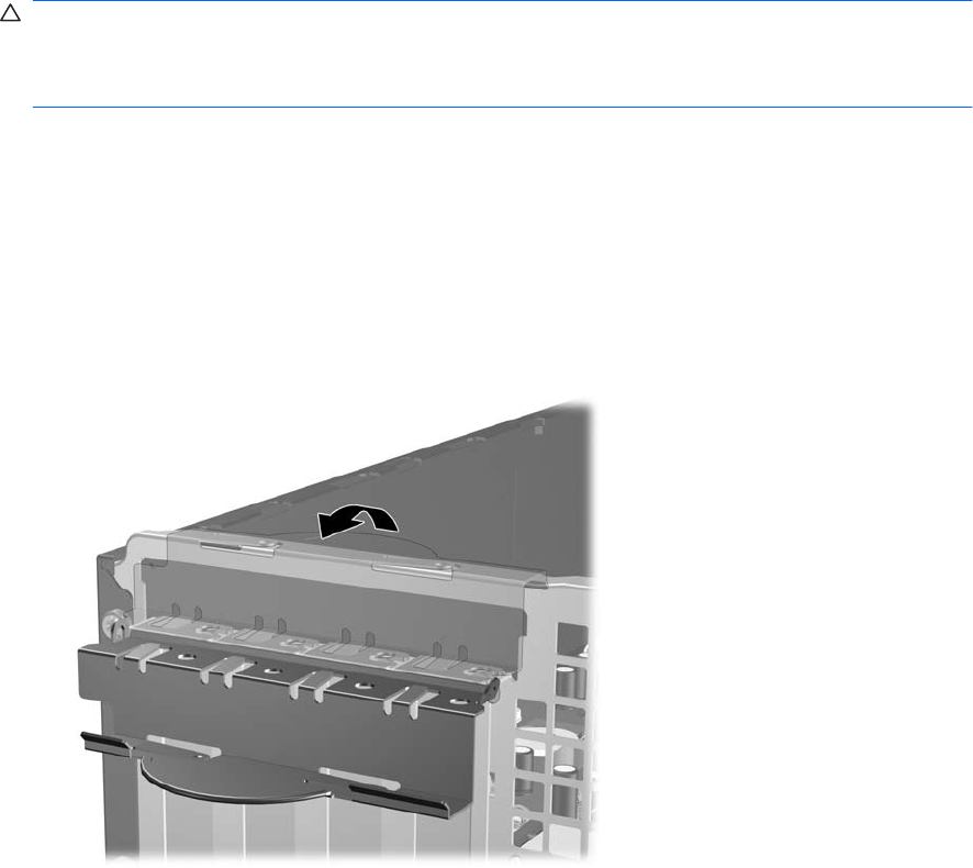 8. Ontgrendel de borgbeugel waarmee de afdekplaatjes van de PCI-slots zijn beveiligd door het