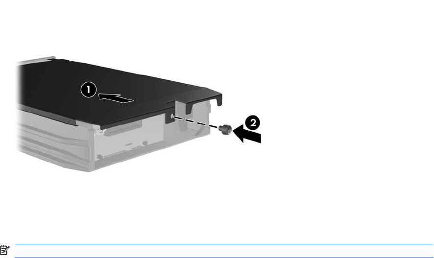 9. Glisaţi capacul pe suport (1) şi montaţi şurubul din spatele suportului, pentru a-l fixa pe poziţie (2).