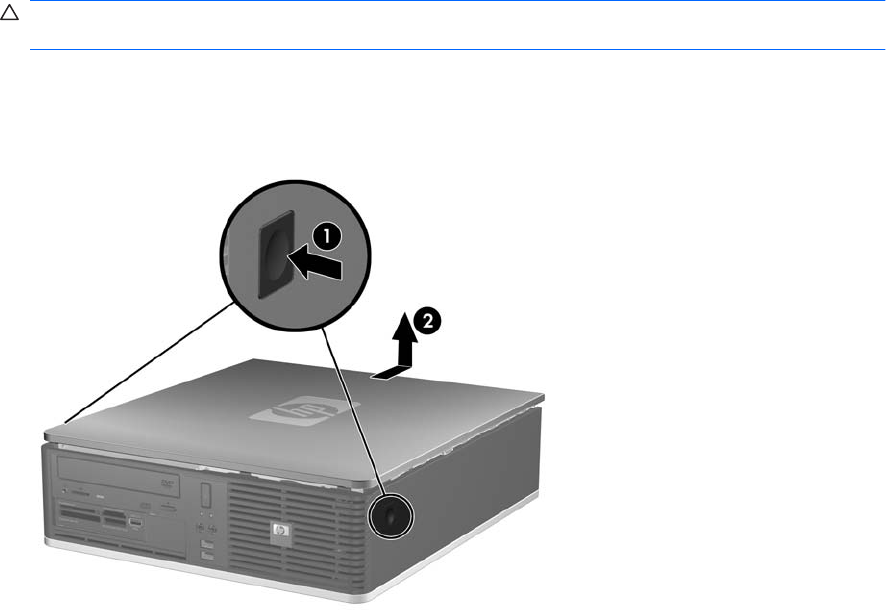 6. กดปุมที่ดานซายและดานขวาของคอมพิวเตอร (1) จากนั้นเลื่อนแผงปดจนสุด และยกฝาครอบขึ้นจากโครงเครื่อง (2)