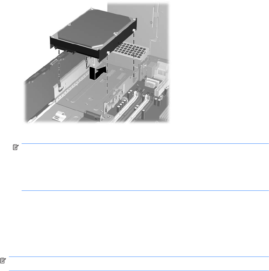 12. กะใหสกรูตัวนําตรงกับสลอตบนโครงไดรฟ ใหกดฮารดไดรฟลงเขากับชองใส แลวเลื่อนไดรฟกลับจนกระทั่งสุดและ